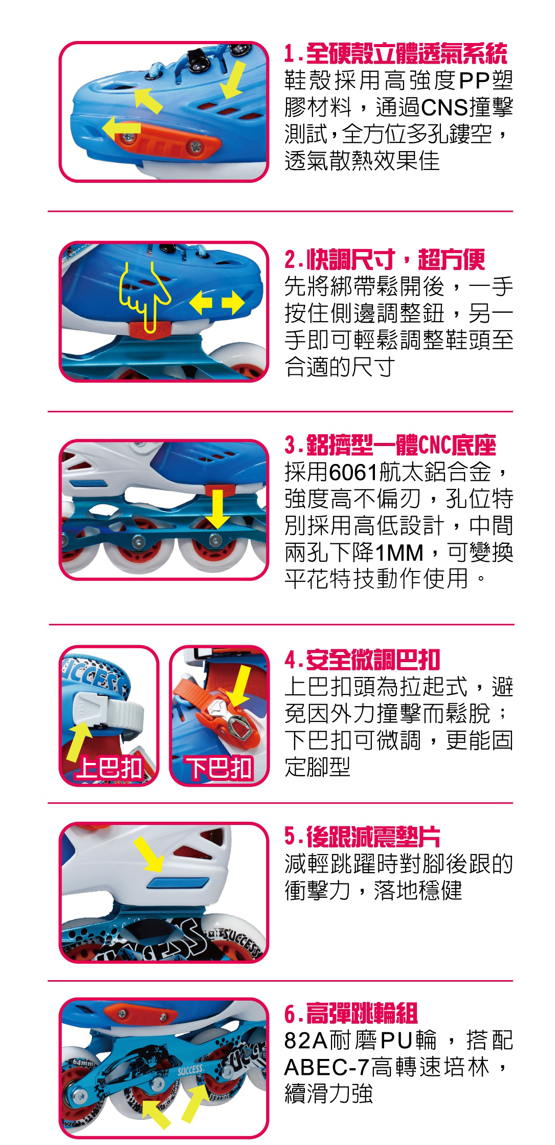 2、新式巴扣頭,溜行時不會彈開,下巴扣可以微調,穩固腳型。