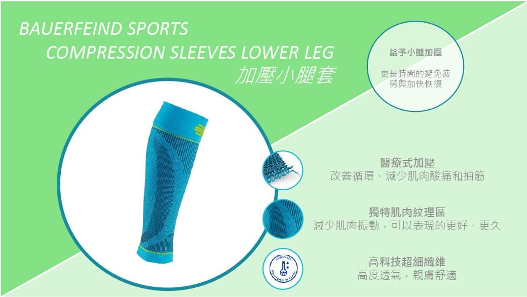 Bauerfeind 運動壓縮小腿套融合精準壓縮區域設計,有效提升氧氣輸送效率並促進血液循環,從而帶來更長的耐力、更快的恢復、減少疲勞以及更多的能量。